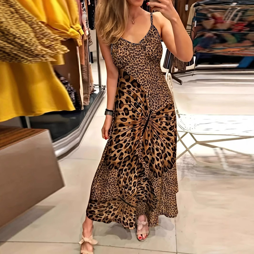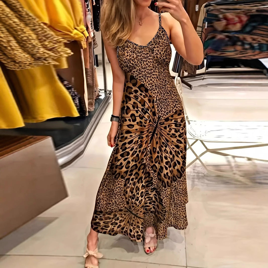 2025 New Ladies Sling Leopard Butterfly Print Dress V-Neckless Skirt