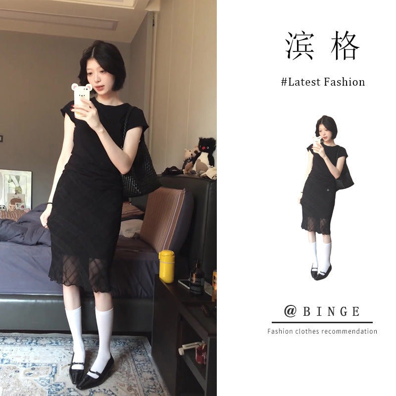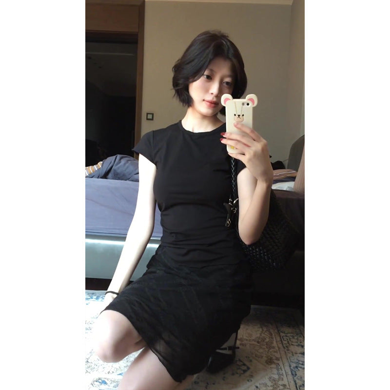 Black Niche High-End Set Women's 2025 Summer Body-Repair Short-Sleeved Blouse Mesh Lattice Half-Dressed