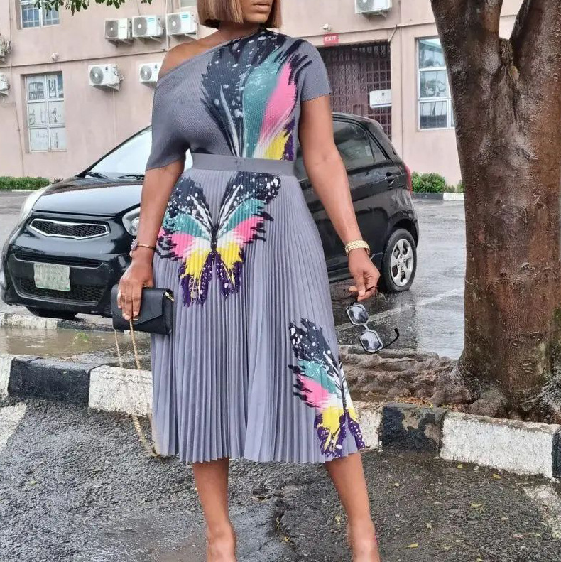 D298 Large-Size Women's Summer Fashion Temperament Print Short-Sleeved Top Dress Folded Skirt African Suit HZ0107