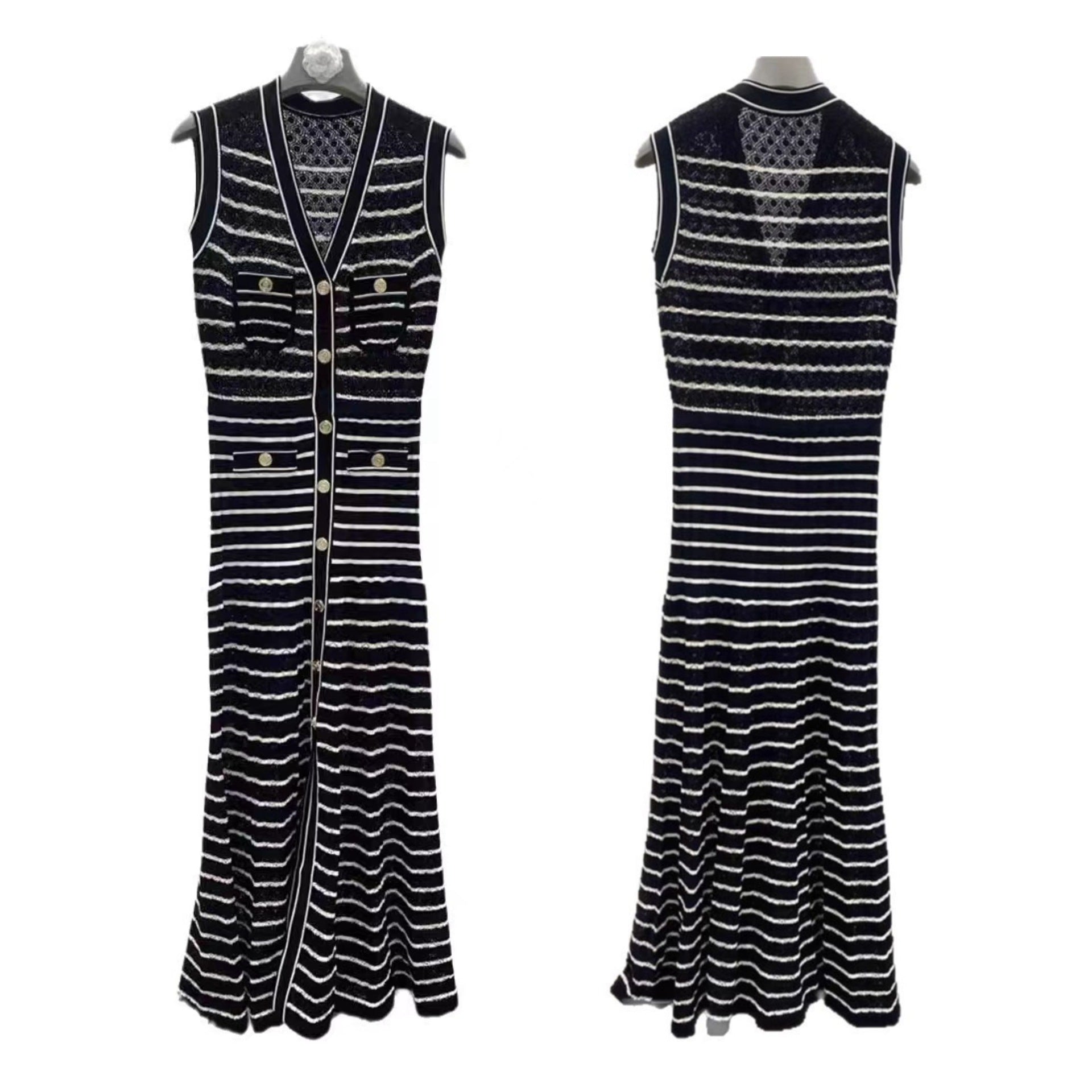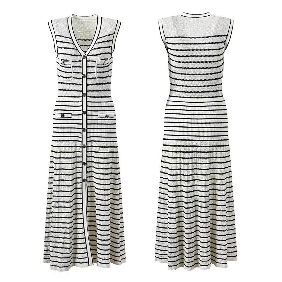 Exploding Knitted Dress Hollow Stripe V-Neck Sleeveless Temperament Elegant Summer Skirt HZ0107