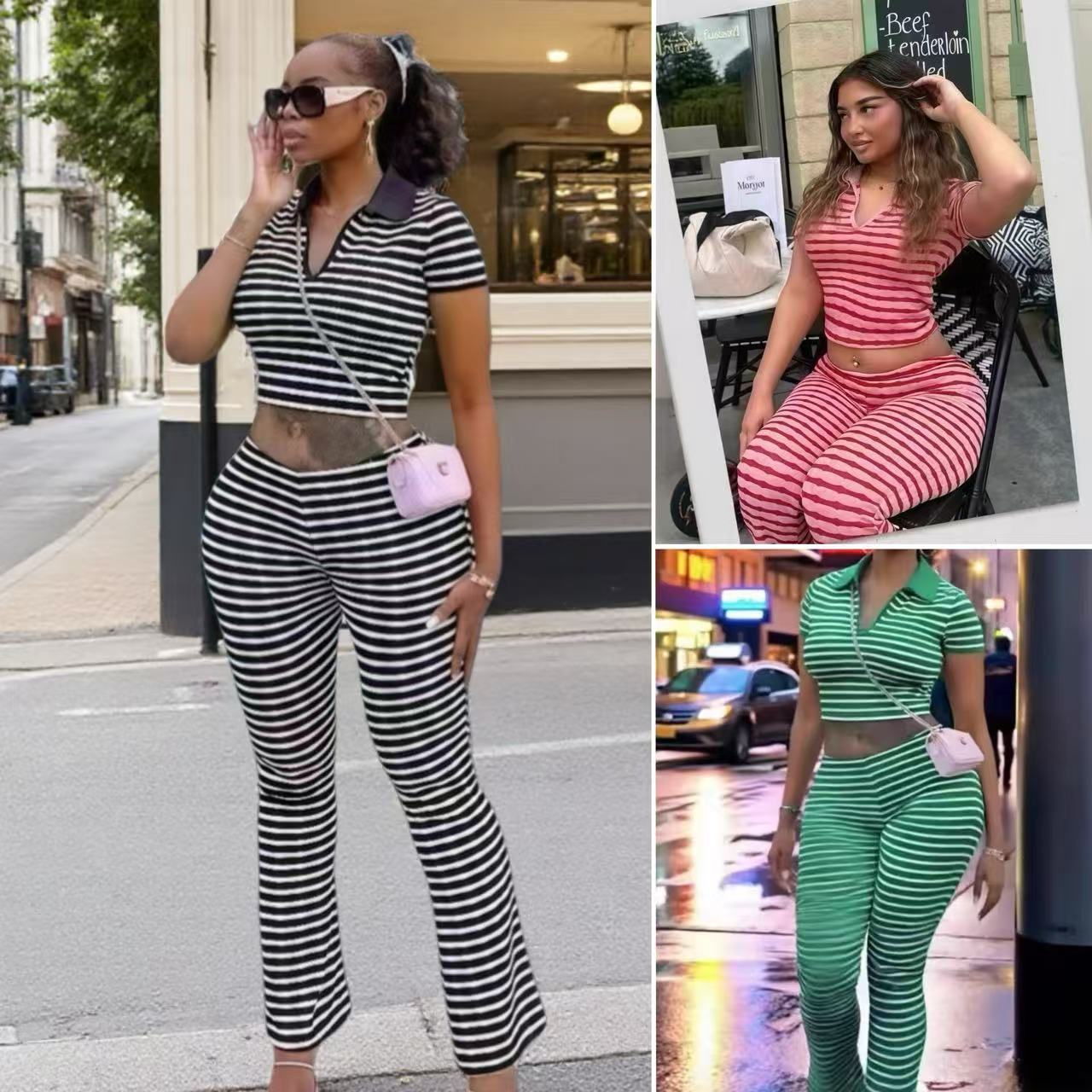 Fashion POLO Shirt With Striped Horn Pants Summer New Knitting Suit Woman HZ0107