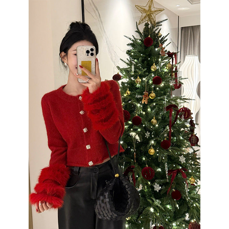 French Small Fragrant Red Hairy Long-Sleeved Sweater Women's Autumn And Winter Unique Beautiful Hairy Sleeve Knitted Open Shirt Thick