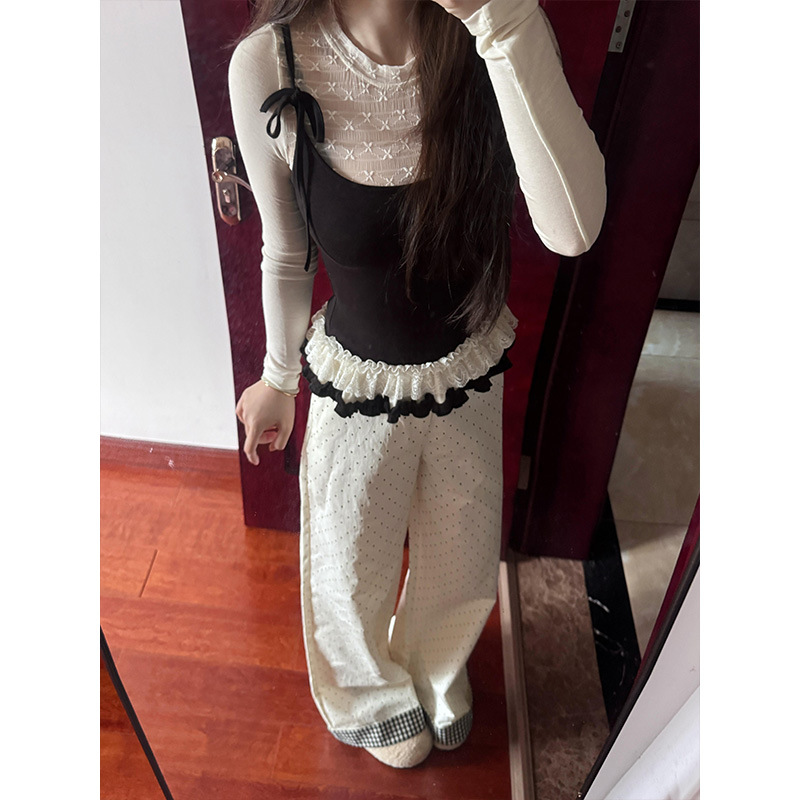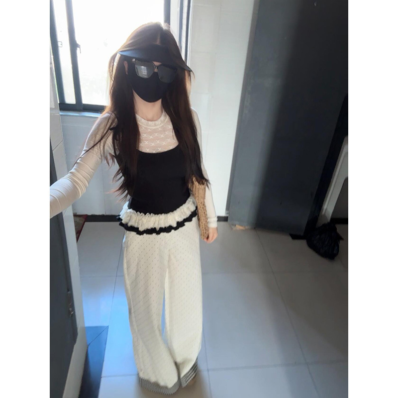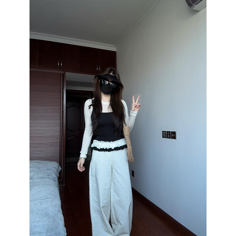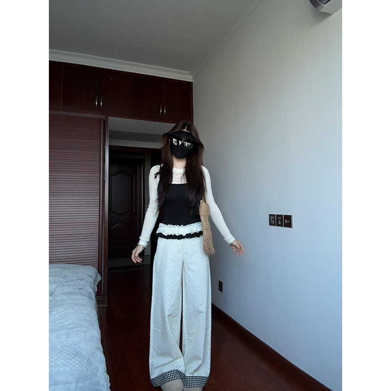 Korean Rice White Temperament Spliced High-Waisted Casual Pants Women Spring New Small Loose Broad Legs Long Trousers