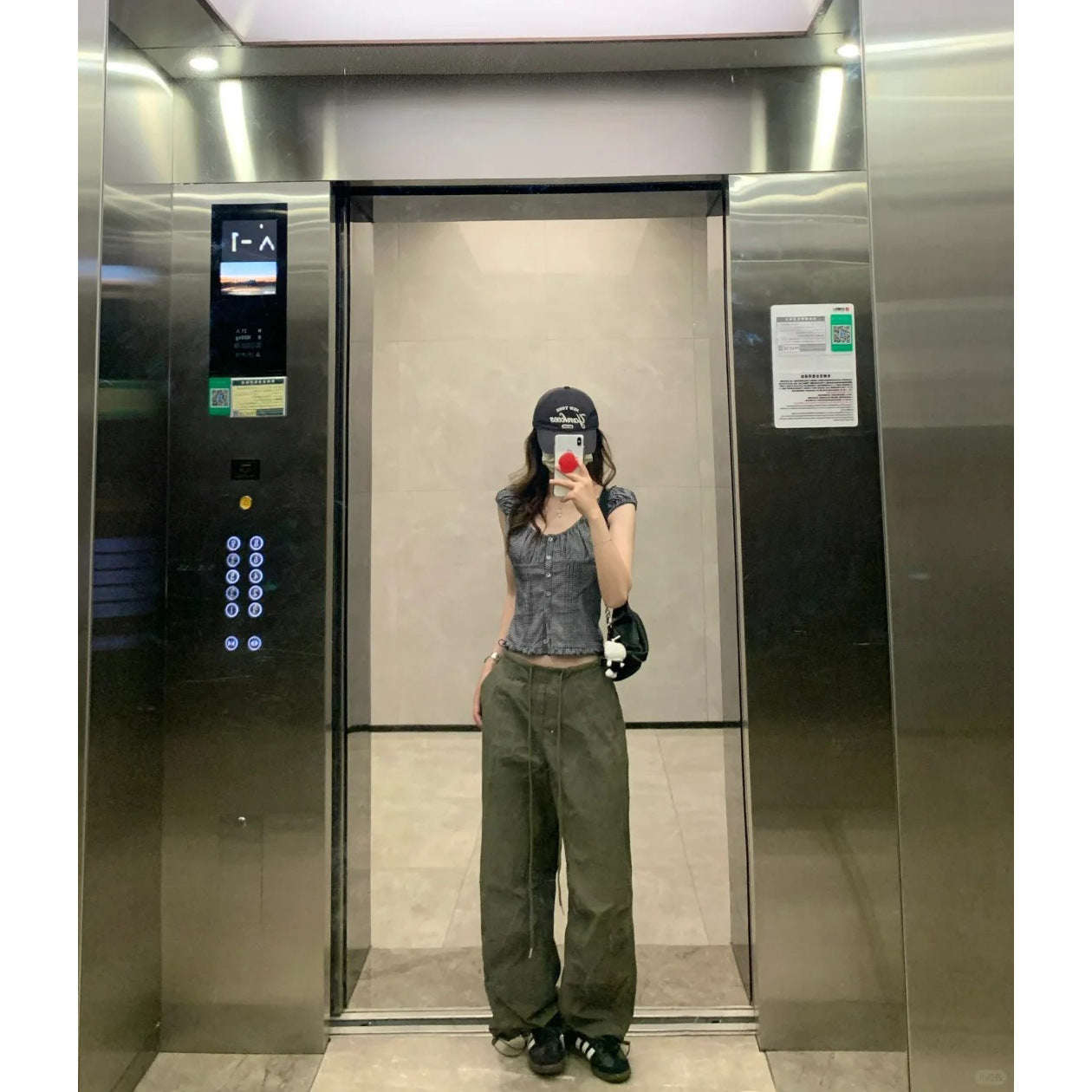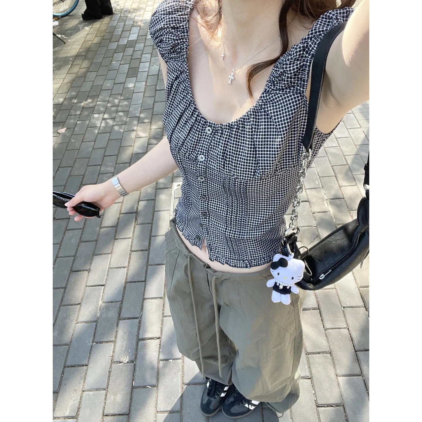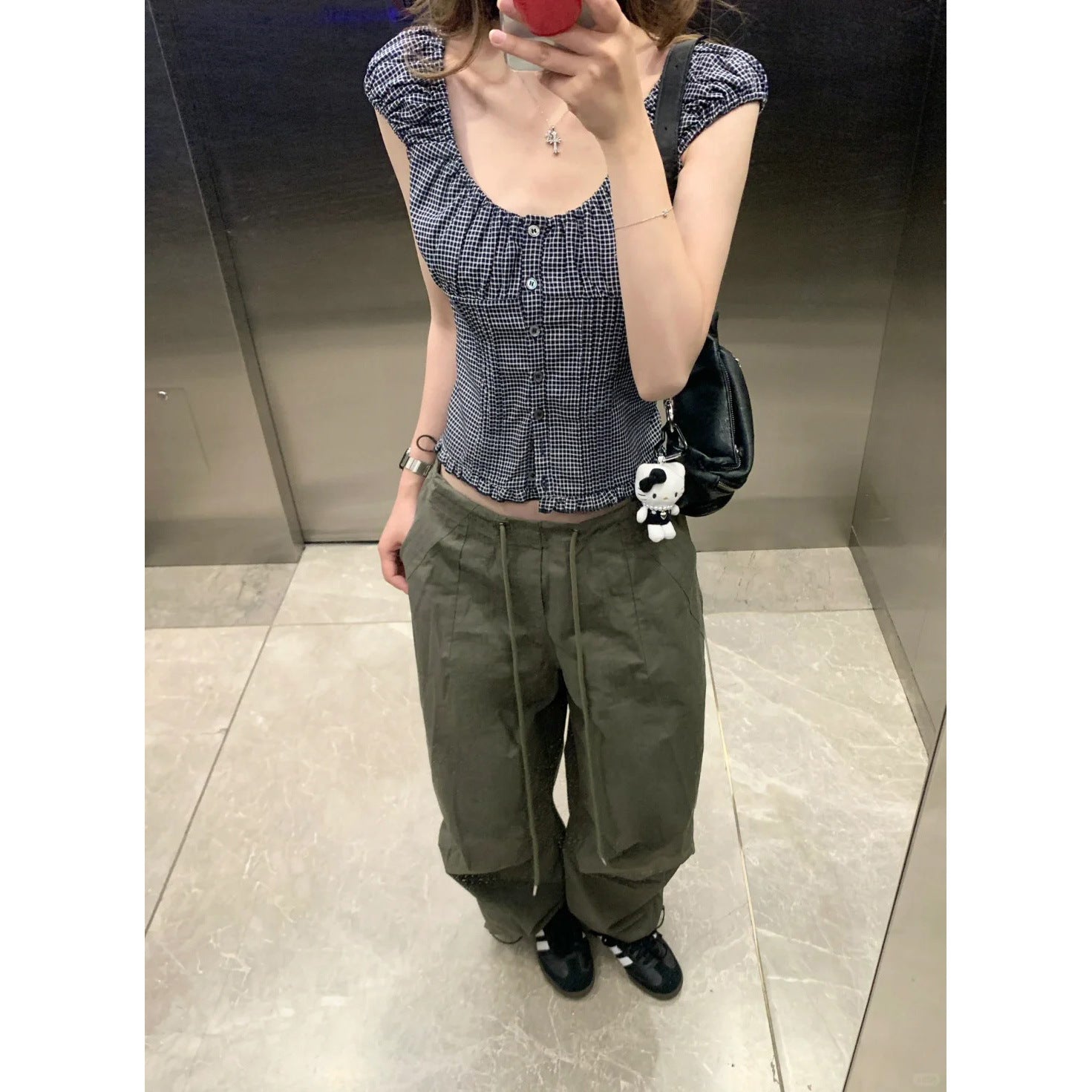Korean Temperament Lattice Square Collared T-Shirt Woman 2025 Summer To Collect Thin Niche Blouse Broad Leg Slack Suit