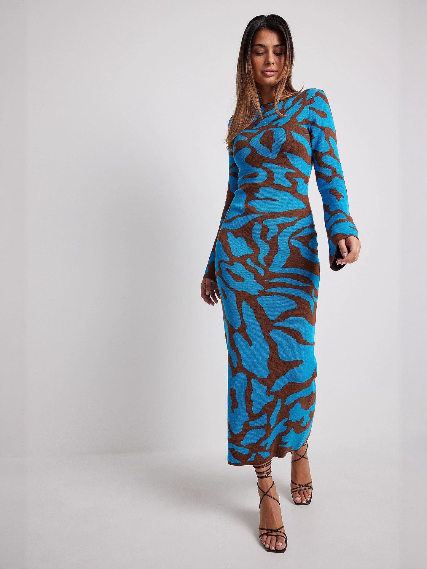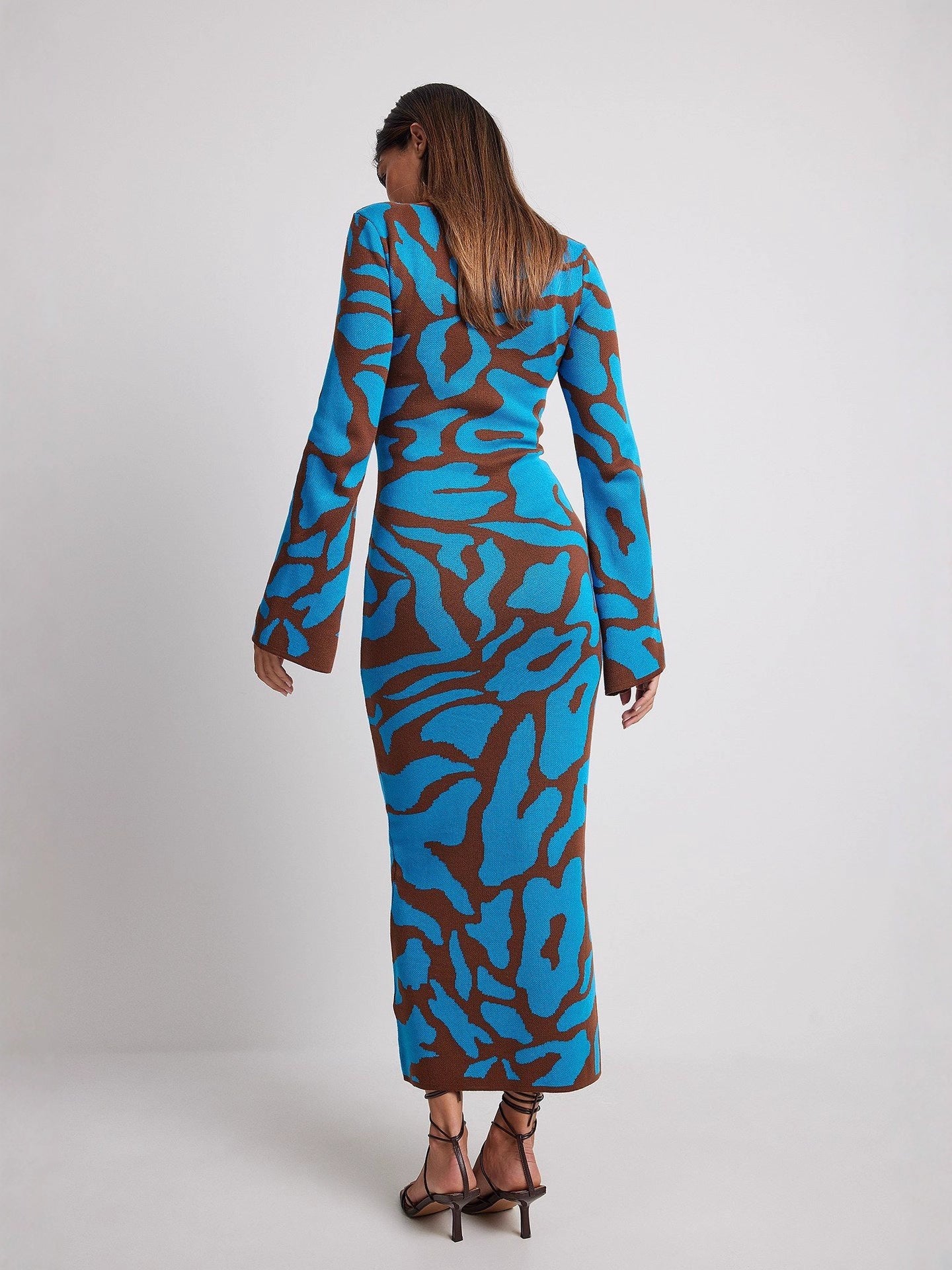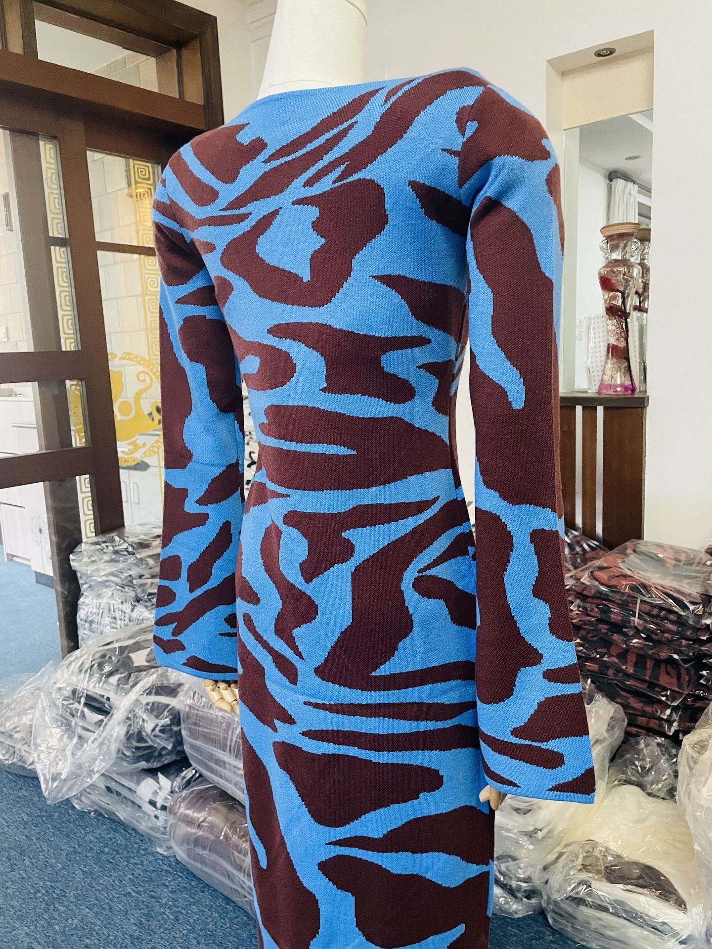 New Women's Sexy Knitted Leopard Print Long-Sleeved Dress Sweater Long Dress