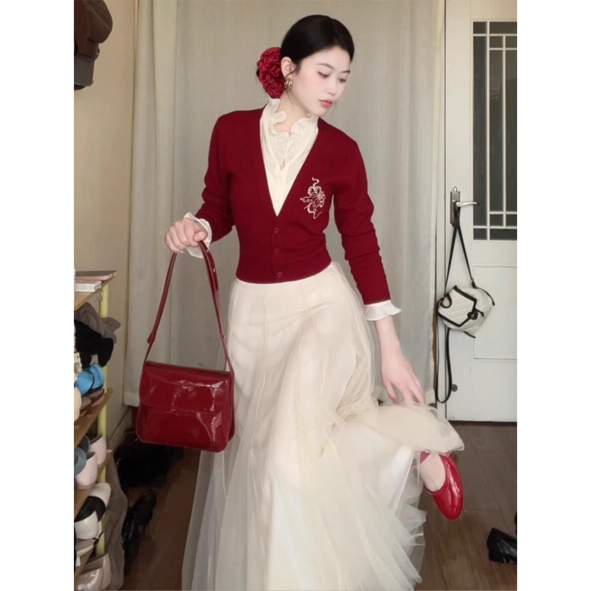 Real Atmosphere Feel Red Fake Two Embroidered Wooden Ear Sweater Women Autumn And Winter Oceanic Knitting Set