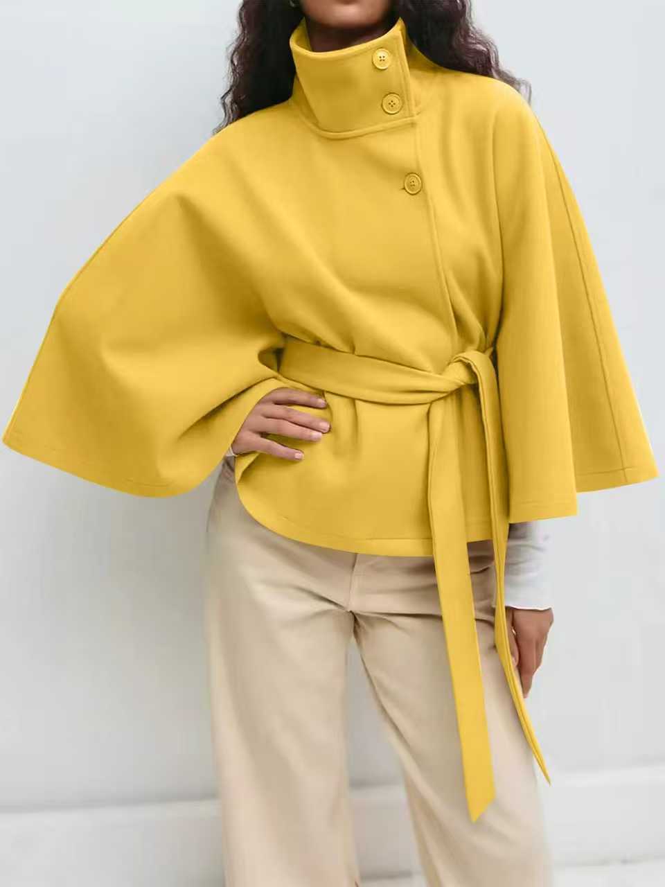 Women's Autumn And Winter New Fashion Pure Color Cape Collar Collar Belt Wind Coat HZ0107